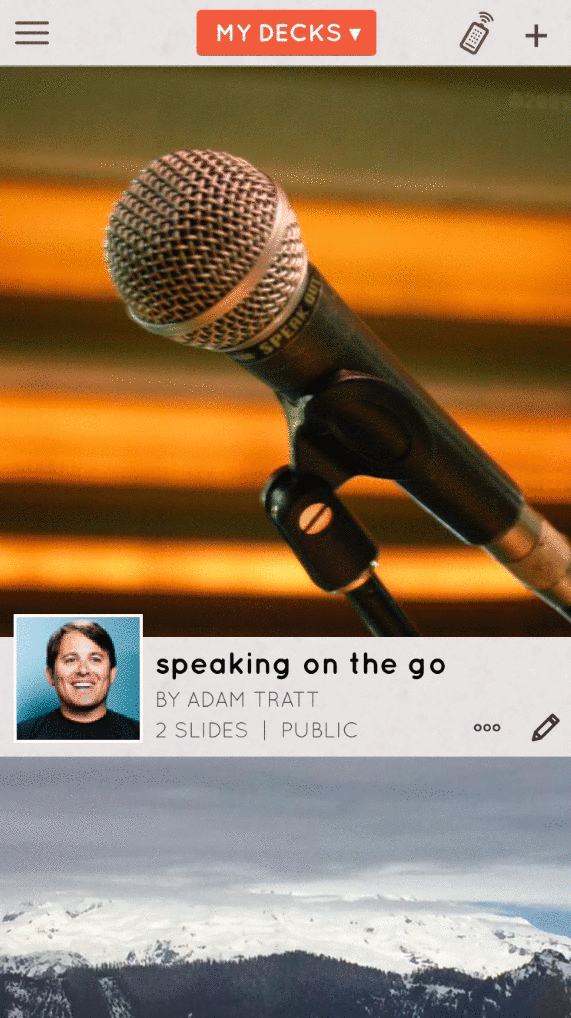 To create a new deck on iPhone, click the "+" button in the top right corner of the main screen. You will be prompted to then enter a title for your deck. After doing this, you will be deposited in the Haiku Deck editor where you can add slides.